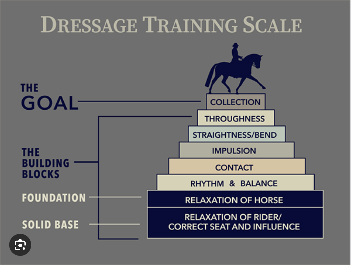 Un caballo que cumple con los primeros peldaños de la escala siempre tendrá más facilidad para progresar y llegar al Gran Premio. En cambio, un caballo que hace piaffe y passage pero carece de ritmo o contacto estable, probablemente se encontrará con bloqueos en su desarrollo o incluso lesiones a largo plazo.
